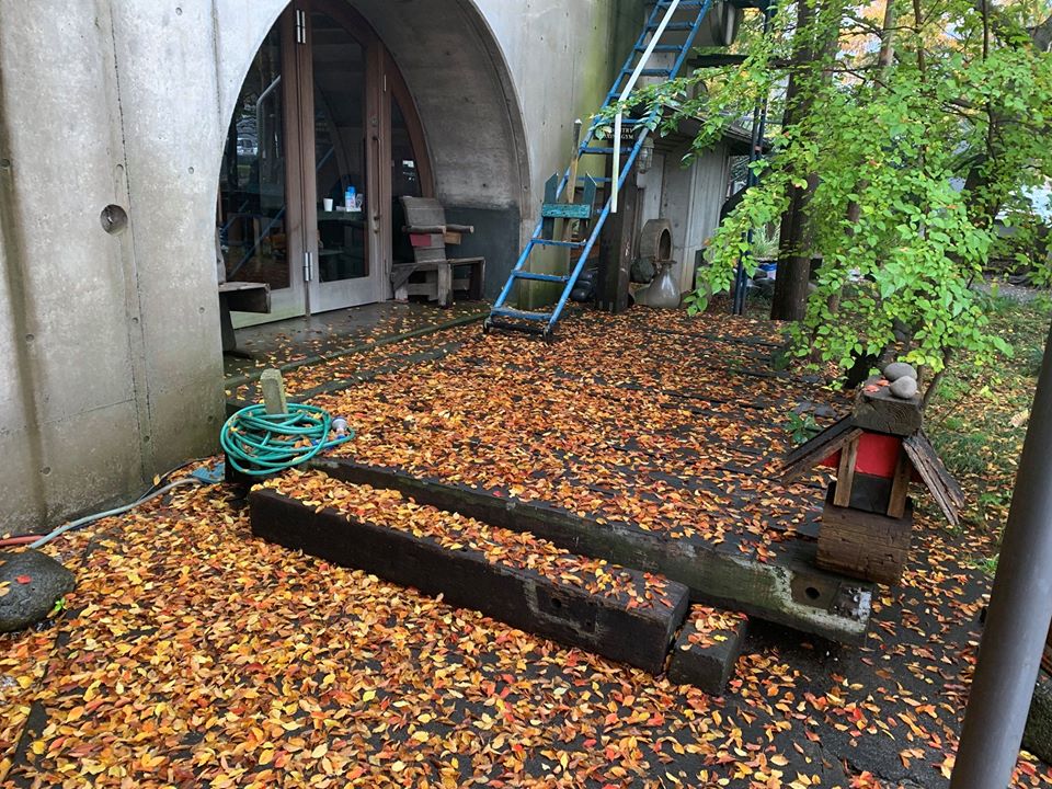 雨が降った後に晴れた日は、落ち葉がカラカラと雨のように降ってきます。エントランスの枕木デッキの上は、黄色からオレンジのグラデーションの落ち葉のじゅうたん。紅葉の始まりは、表のソロの木から・・・。紅葉の仕方で、風が何処を抜けていくのかがわかります。