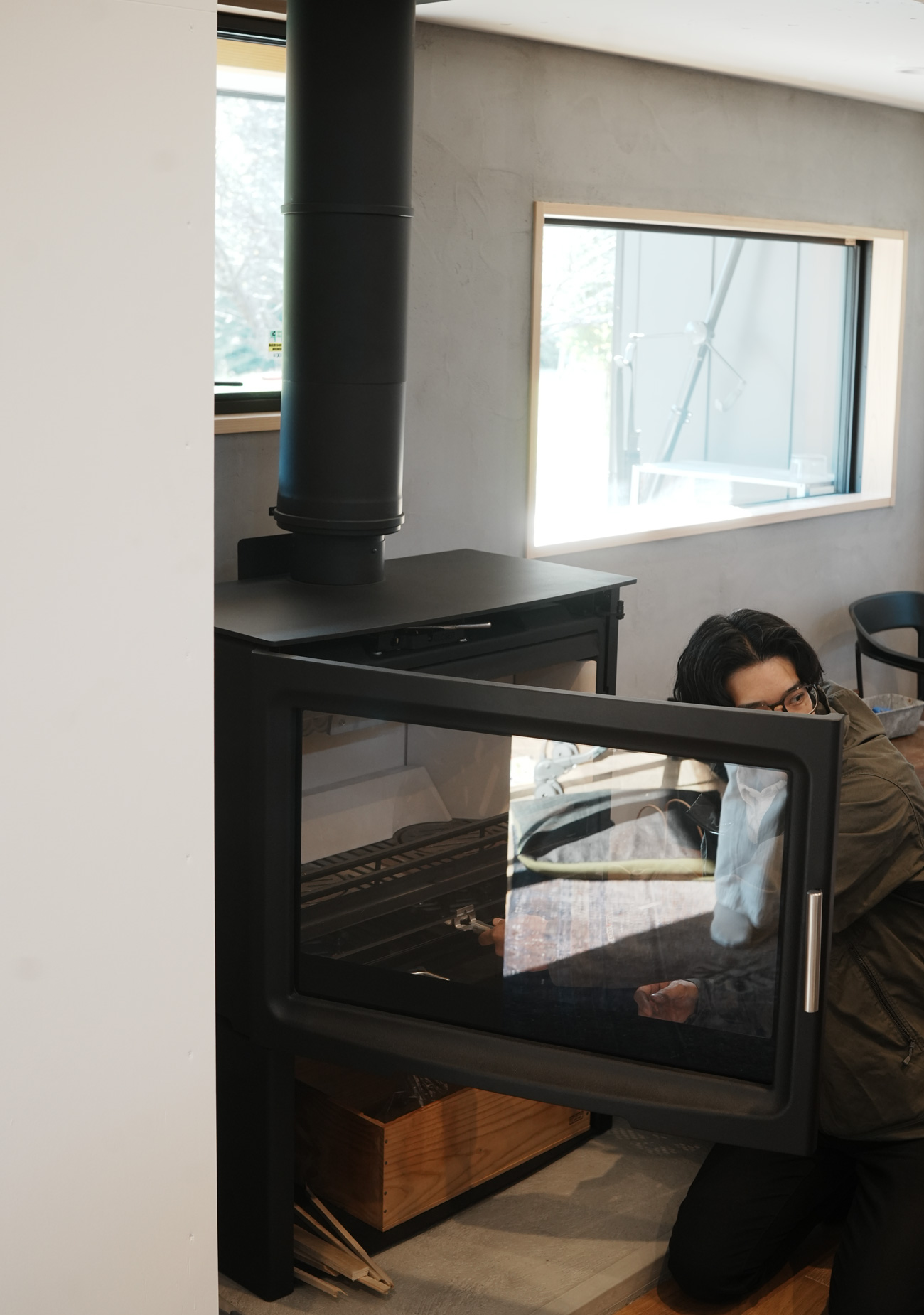 施工にあたっては、床下の荷重補強や、断熱・気密層を貫通する煙突部分の処理など、ストーブ設置特有のディテールにも配慮。