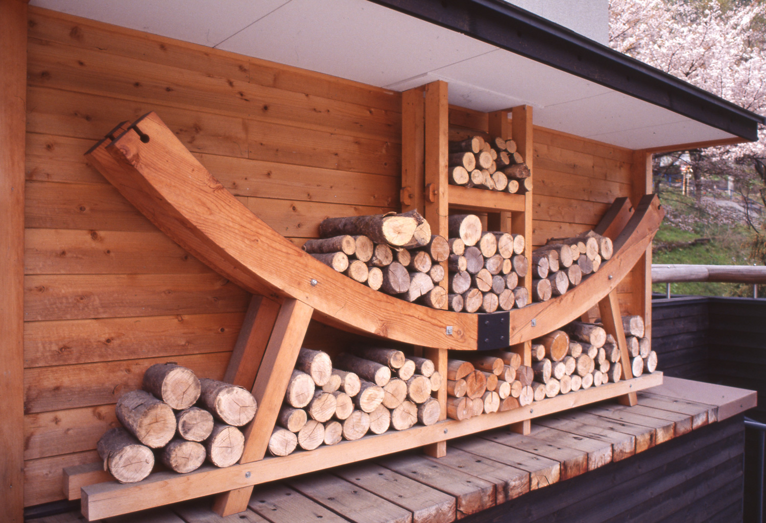 JR青梅線 鳩ノ巣駅の駅前 に『山鳩カフェ』があります。青梅街道沿いに面しているお店の目印は、南東側の外壁いっぱいの大きな造り付け薪置き場。その薪置き場に積まれた薪の姿は壮観です。また、薪自体が増えたり減ったりして、日々変化する外観として、建物に動的な風景をあたえています。