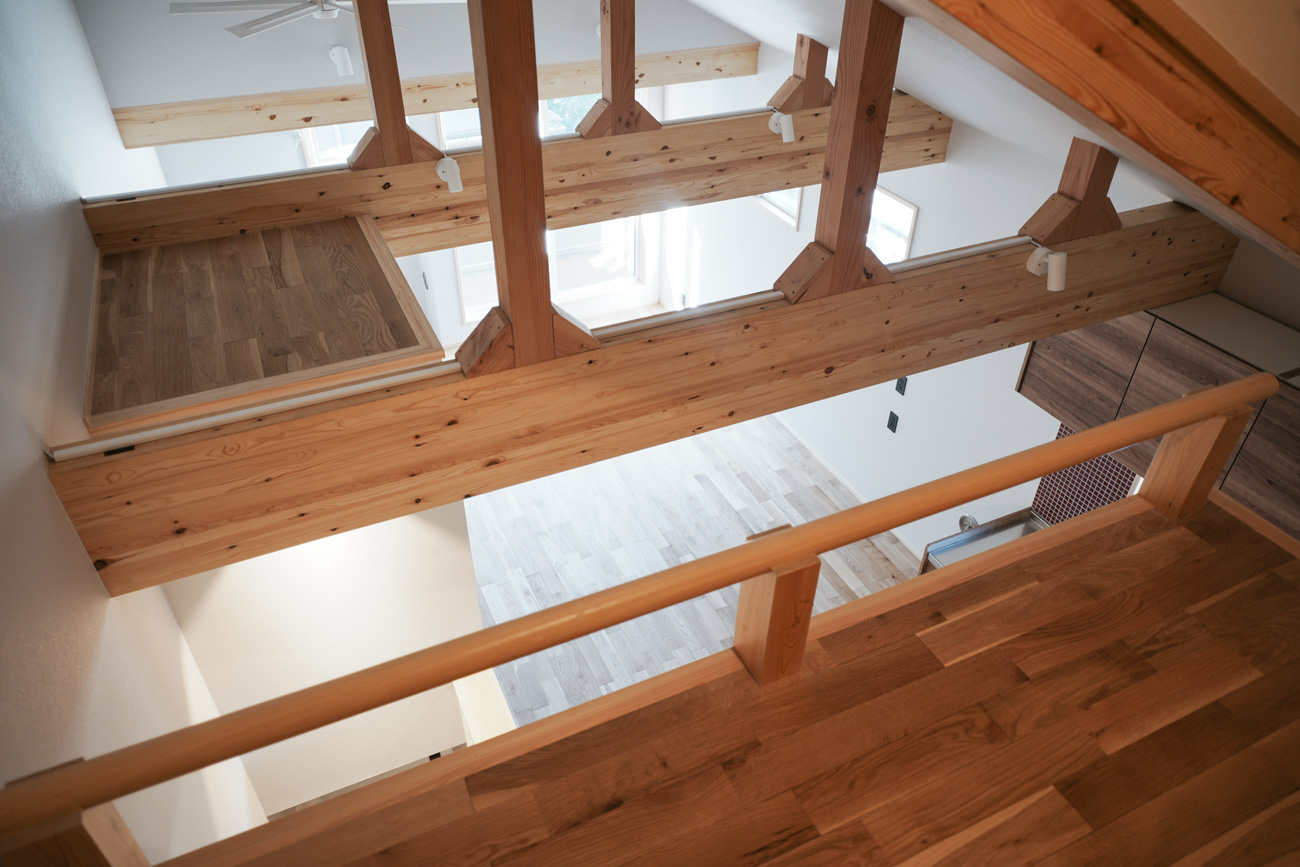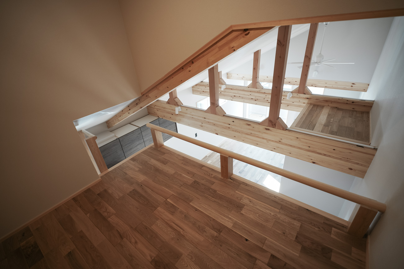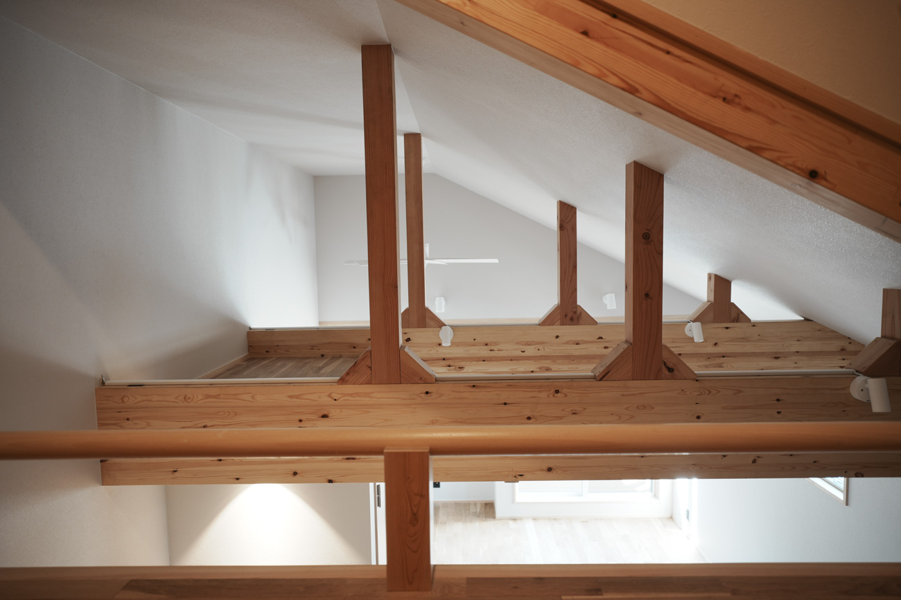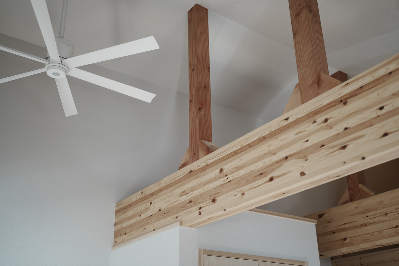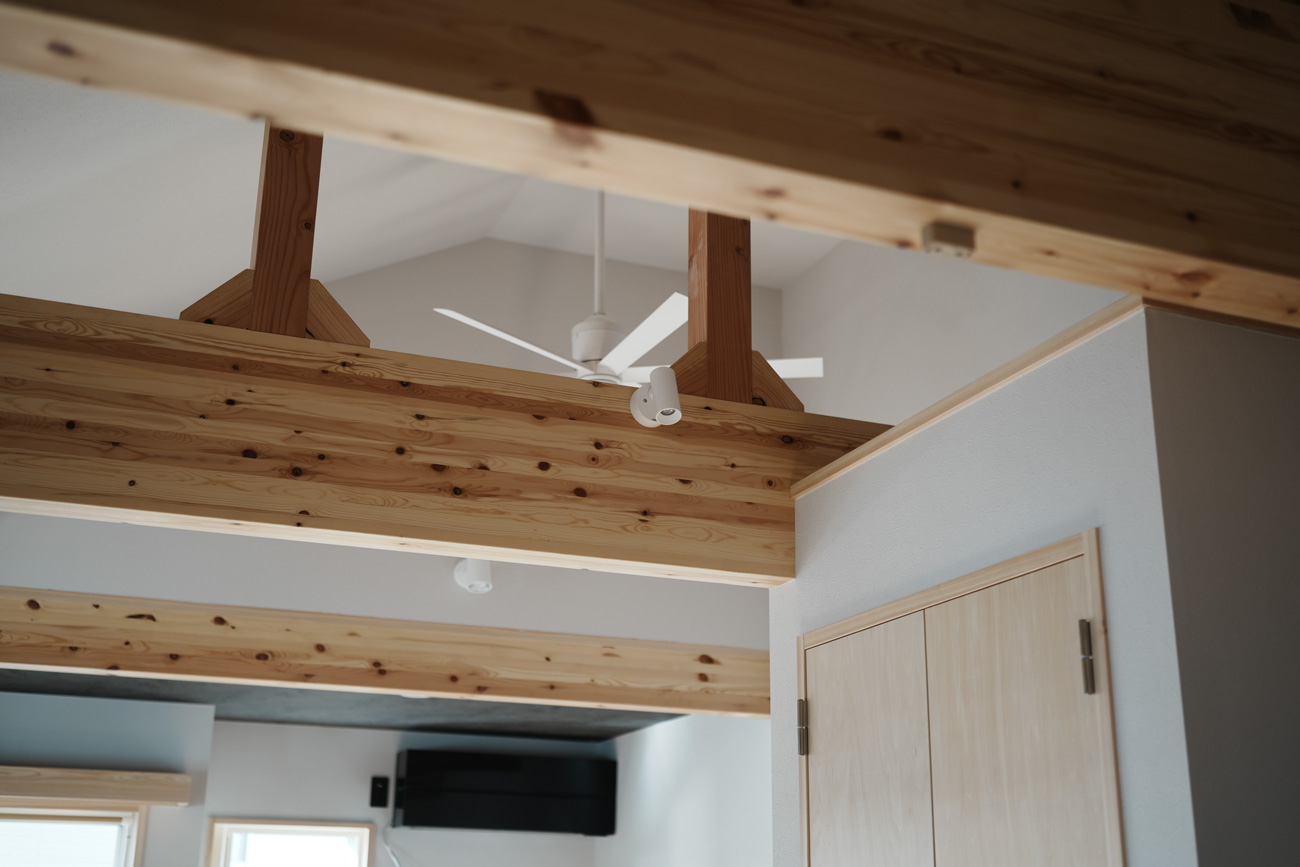 屋根のかたちに合わせて天井高を確保できるため、梁をあらわしにして開放的な空間をつくることもできます。