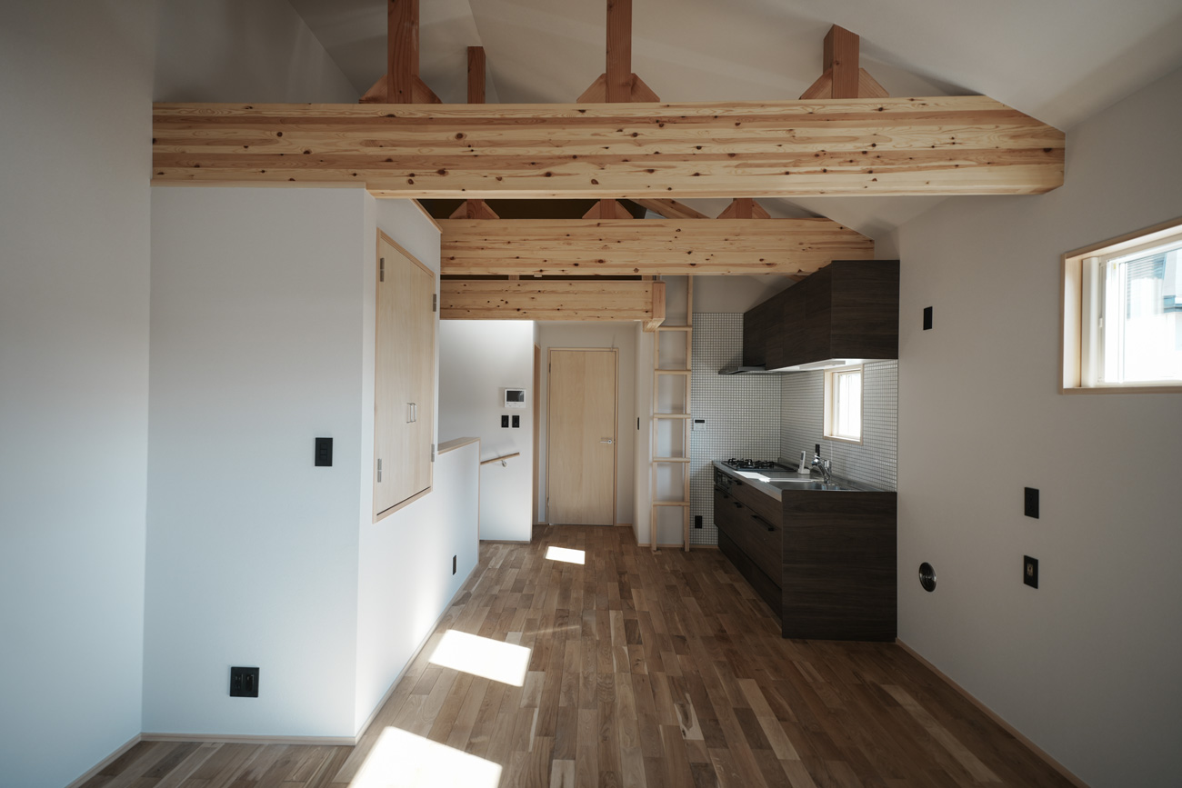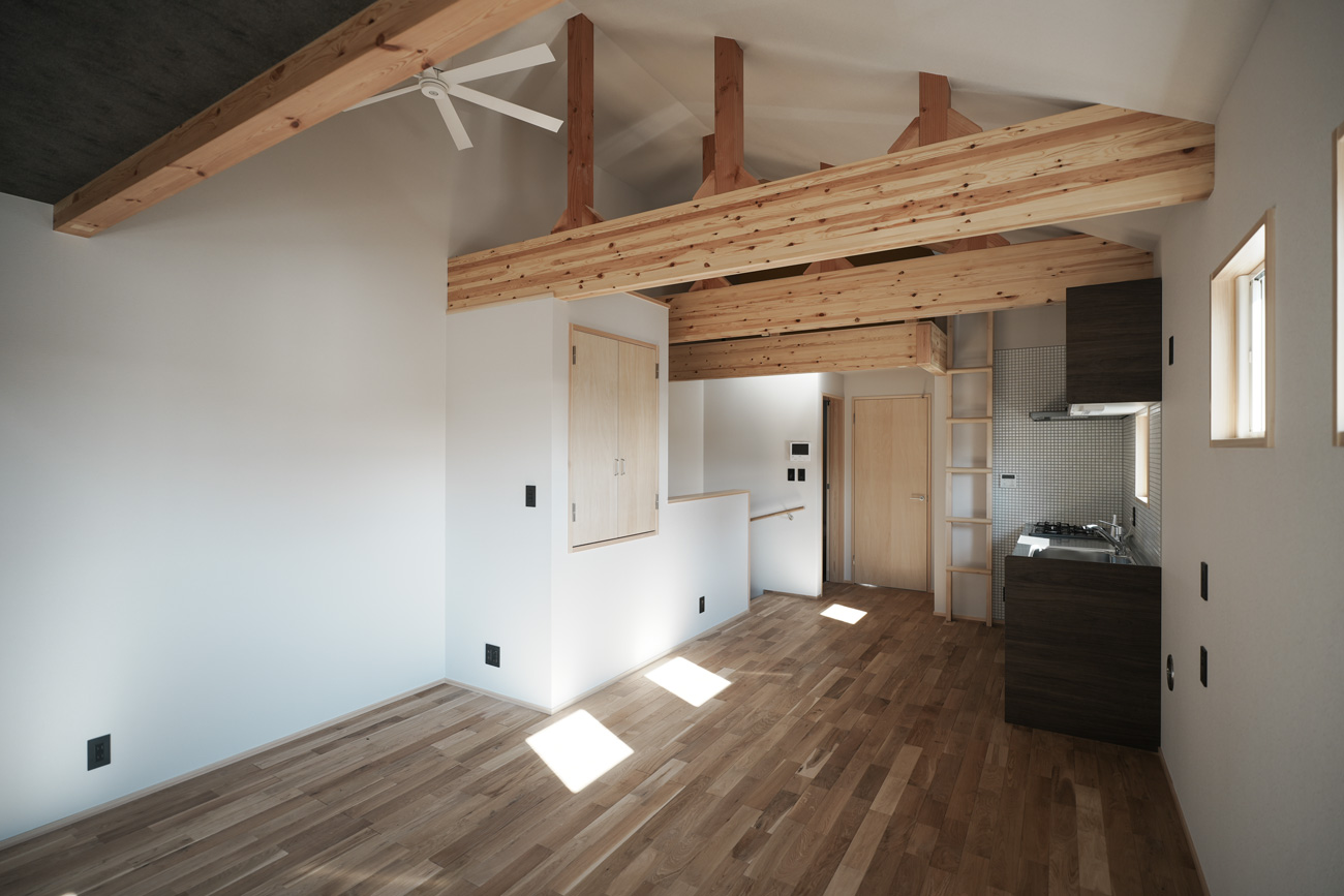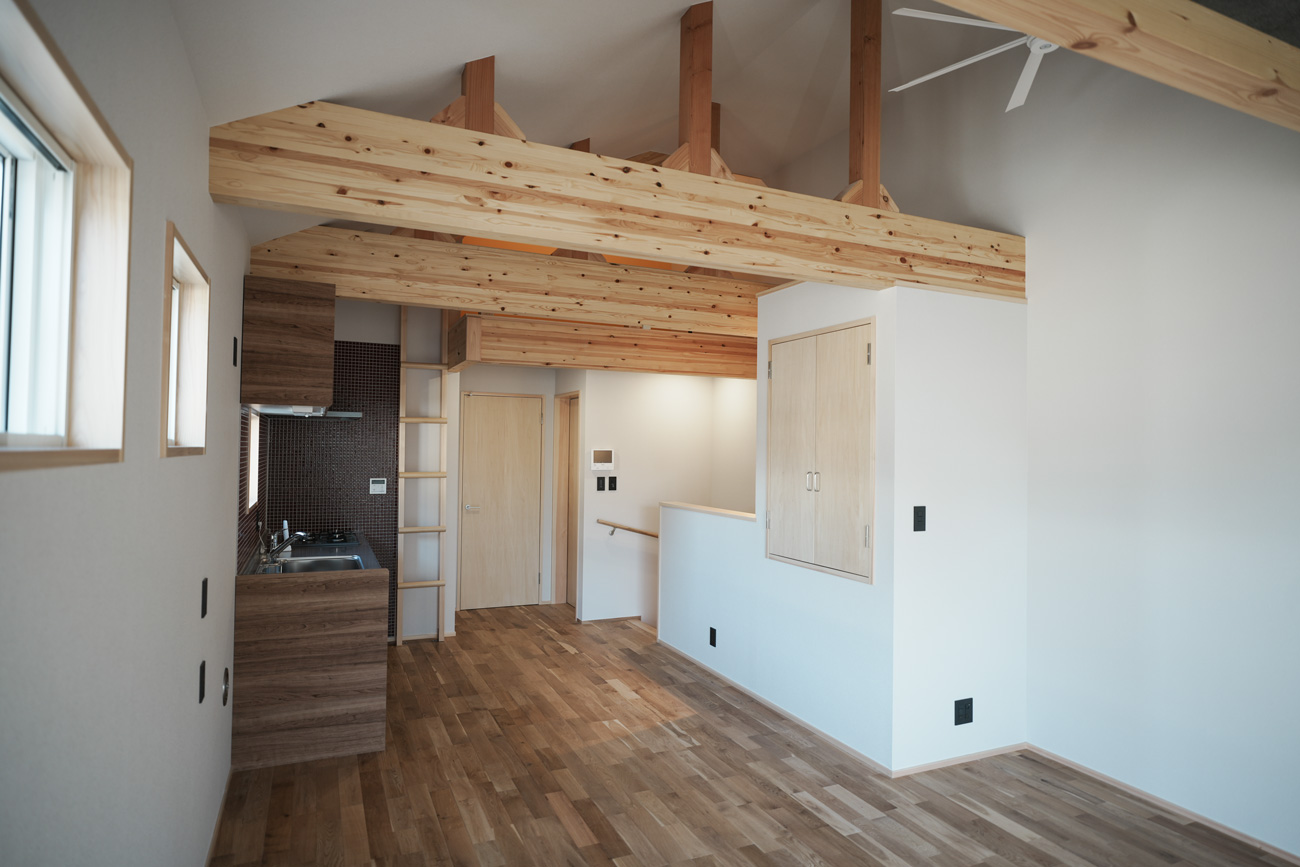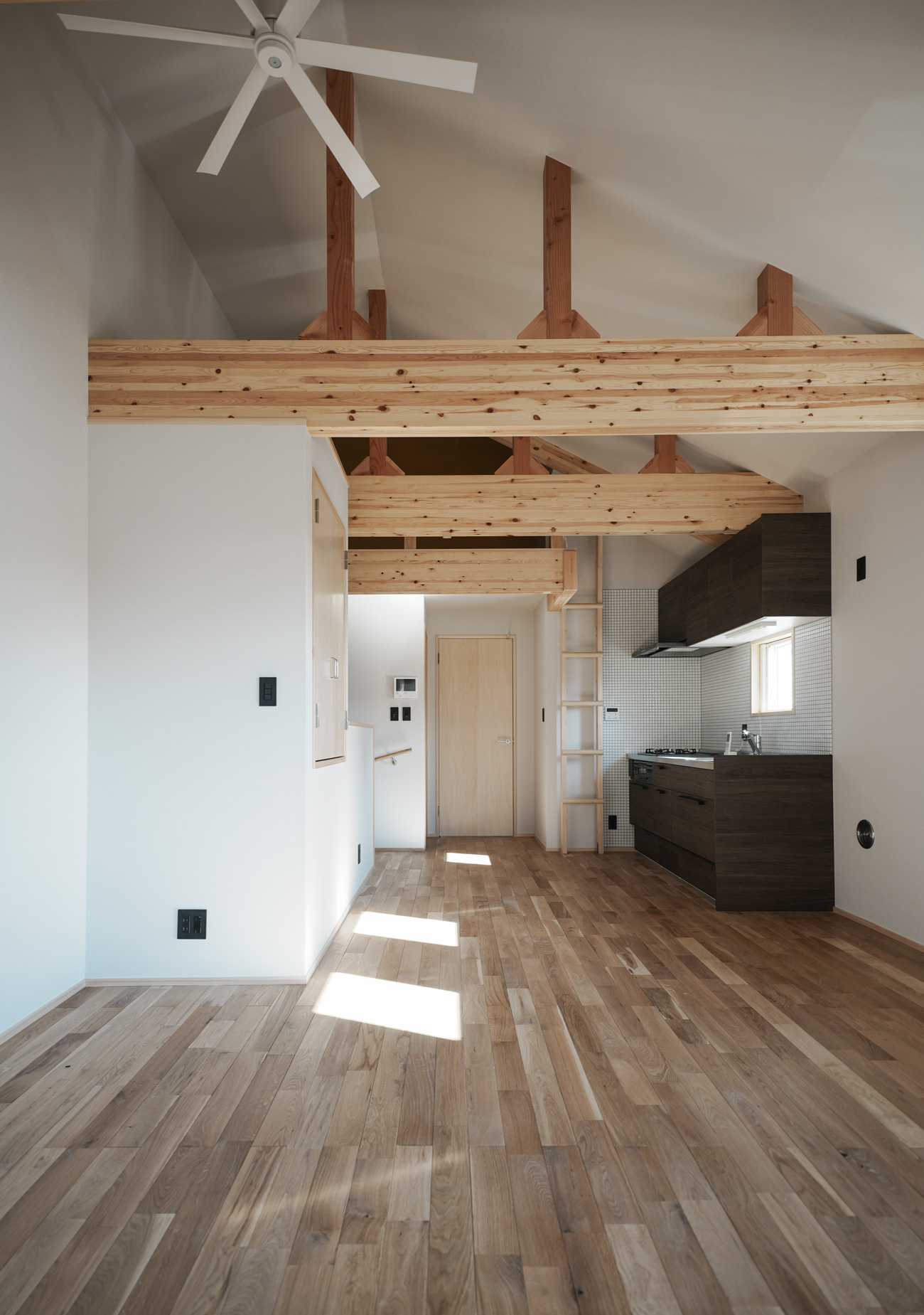 屋根のかたちに合わせて天井高を確保できるため、梁をあらわしにして開放的な空間をつくることもできます。