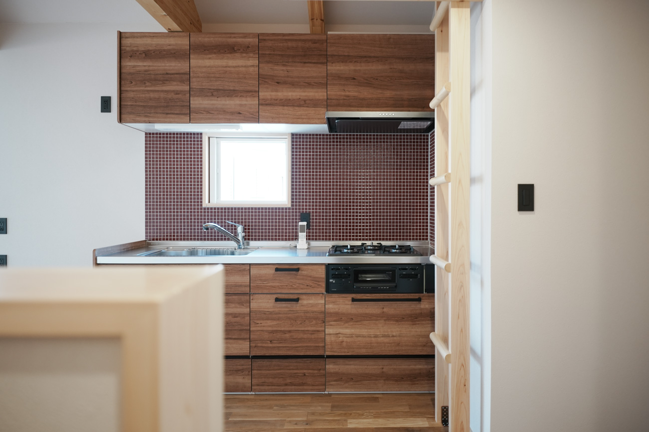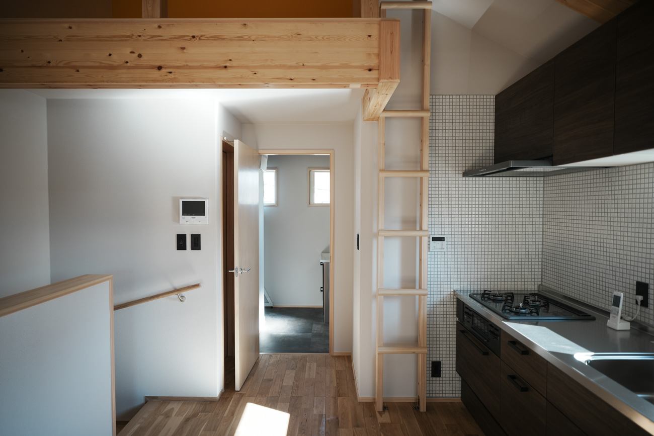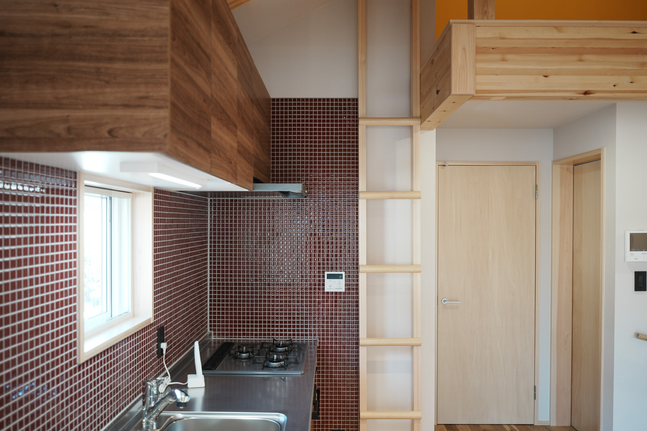 【モザイクタイルのキッチンやロフトに登るための梯子】