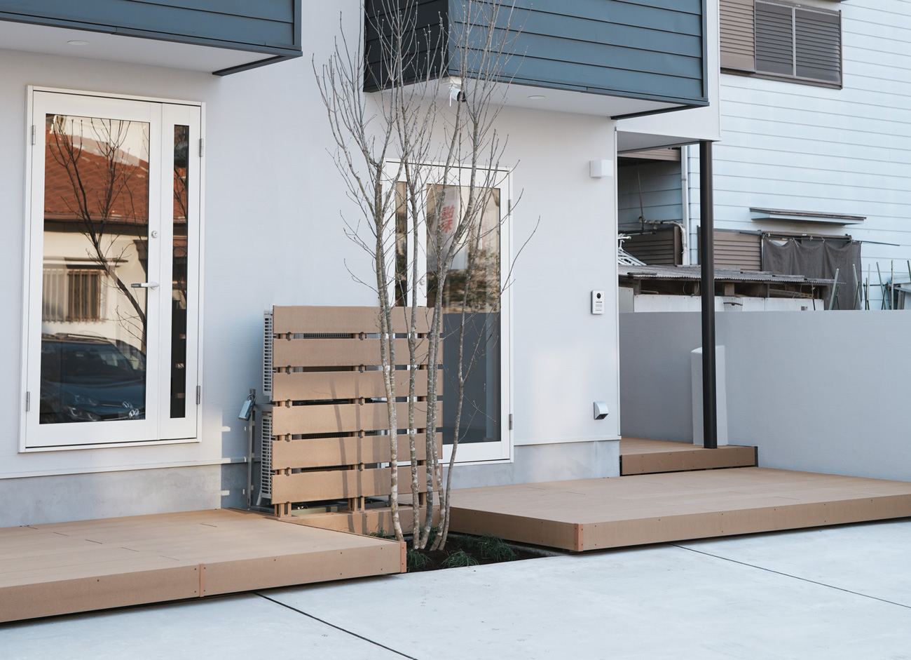 1.2階を専有する住戸には、それぞれの玄関とは別に、カーポートとデッキテラスに面した小さな部屋が備わっています。